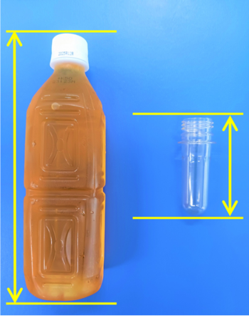 まず、ペットボトルの原型である「プリフォーム」の状態での配送です。元々はペットボトルの形に成形したものを充填工場に配送していましたが、ペットボトルの半分以下のサイズであるプリフォームの状態で飲料の充填工場へ輸送し、そこでペットボトルの形にする方法へと変わっていきました。この方法は、一度に大量に運ぶことができるため、輸送効率が向上するとともにトラックの排気ガス削減にもつながります。