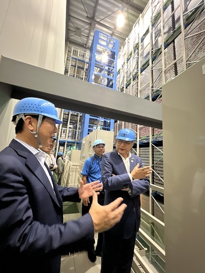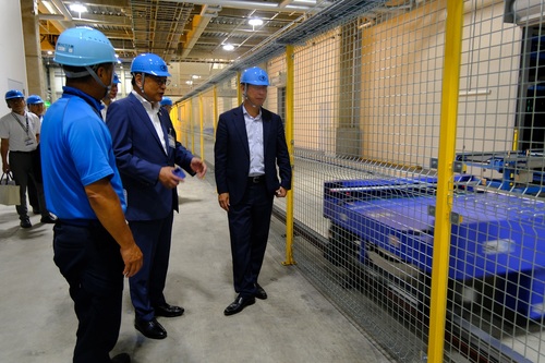 東洋メビウス株式会社では、高密度自動倉庫を採用し、スペースの削減と保管量の増加、入庫から出庫までの自動化を実現しています。高密度自動倉庫棟では、トラックの搬入口まで自動的に荷物が運ばれてくるため、荷物の取り出しからトラックへ積み込むまで、フォークリフトを介した作業がなくなり、待ち時間も少なくドライバー1人でもスムーズに搬出することができます。また、フォークリフトが通行するスペースを削減できるため、保管容量の増加にもつながっています。実際の作業を目にした市長は、ドライバー1人だけで搬出が完結していることに大変感心していました。